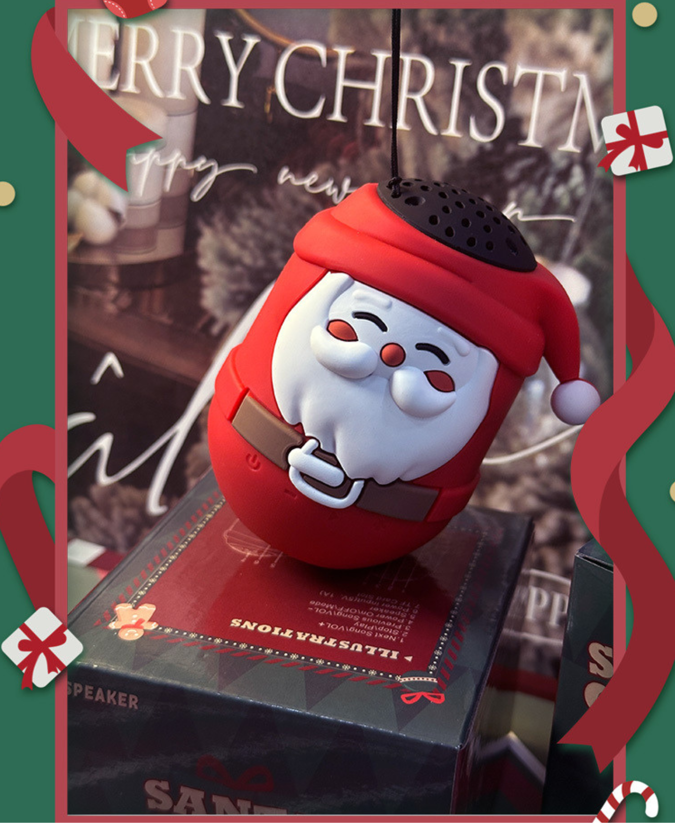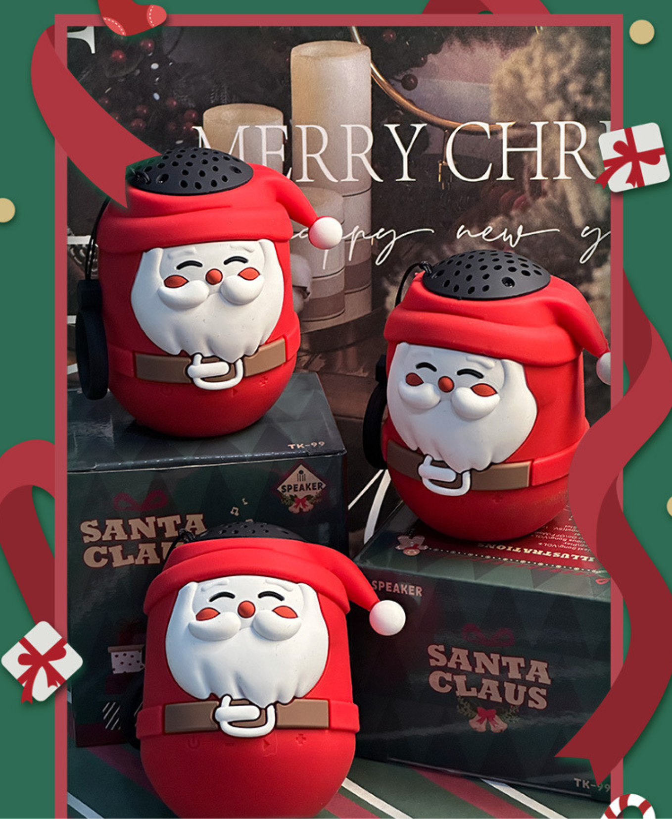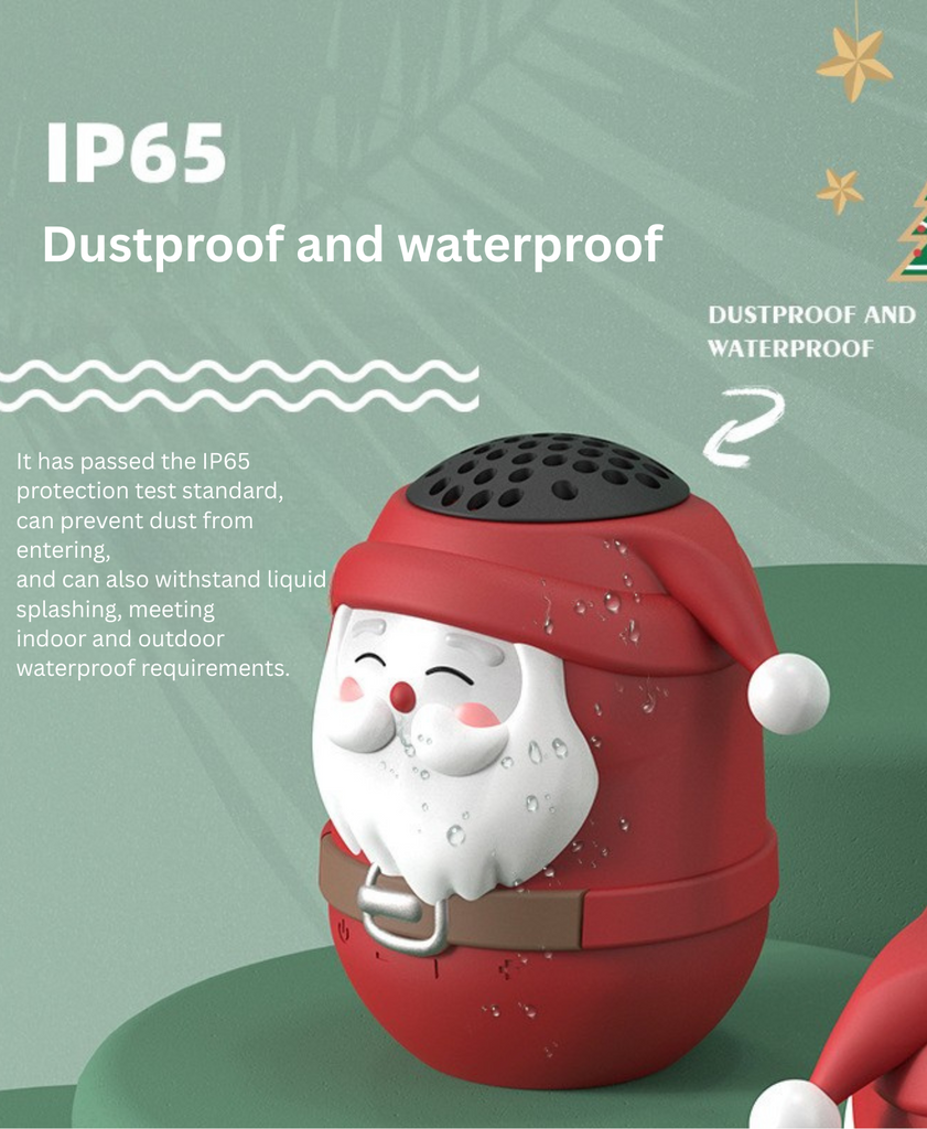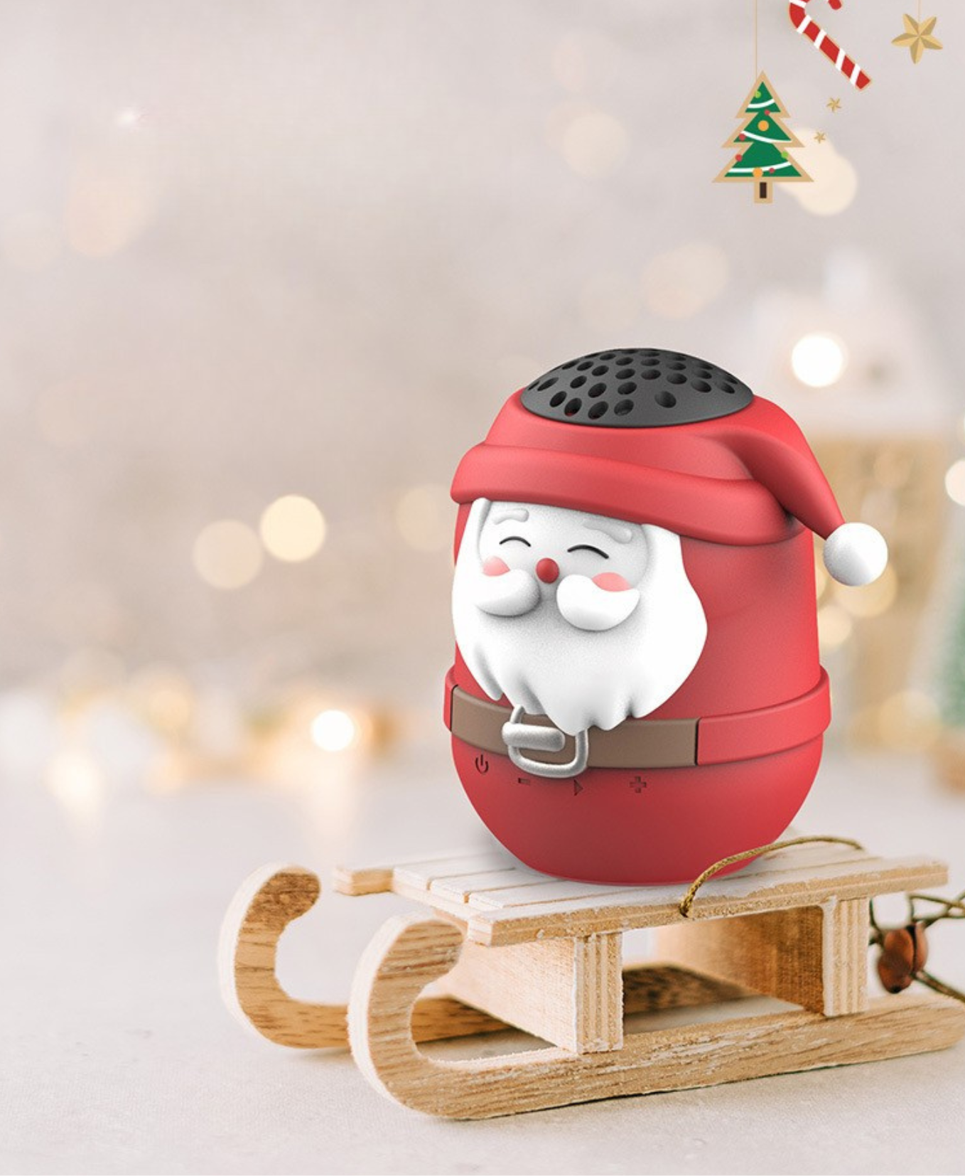 Cute Santa-shaped mini speaker with Bluetooth, TF card, and plug-in support. Portable, waterproof, and perfect for Christmas vibes anywhere.