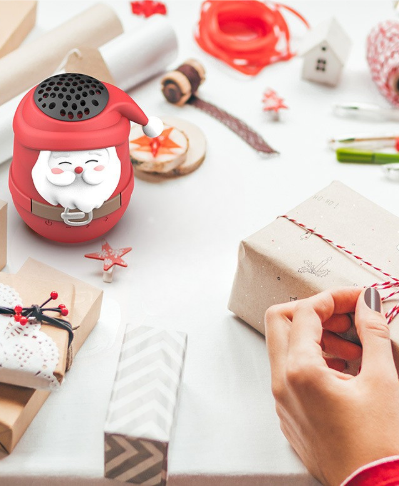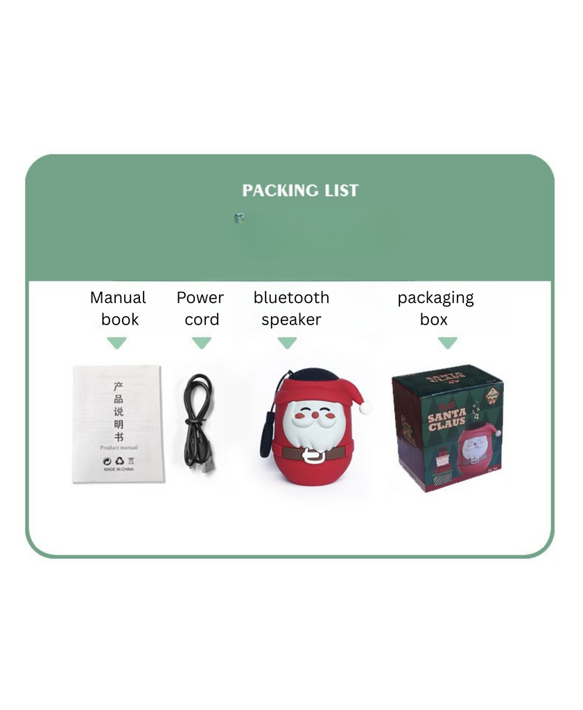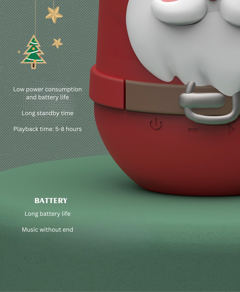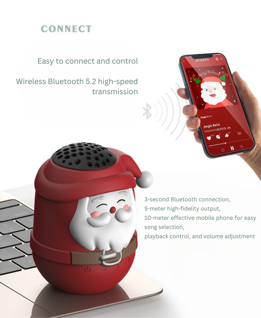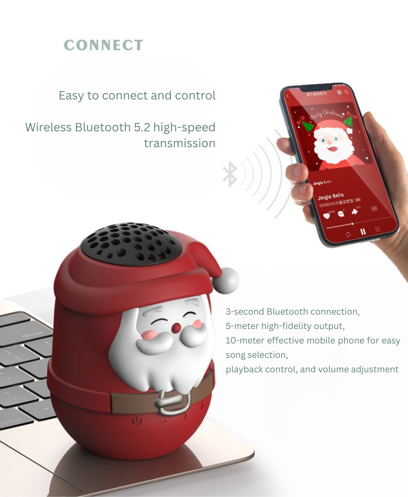 Cute Santa-shaped mini speaker with Bluetooth, TF card, and plug-in support. Portable, waterproof, and perfect for Christmas vibes anywhere.