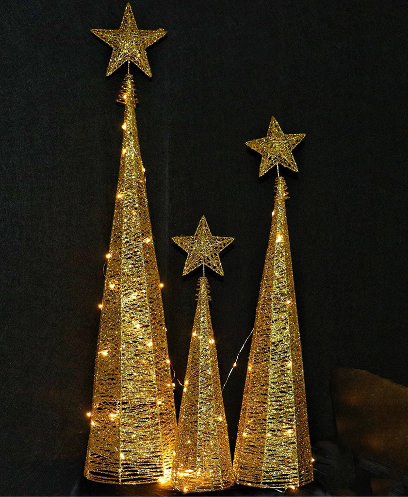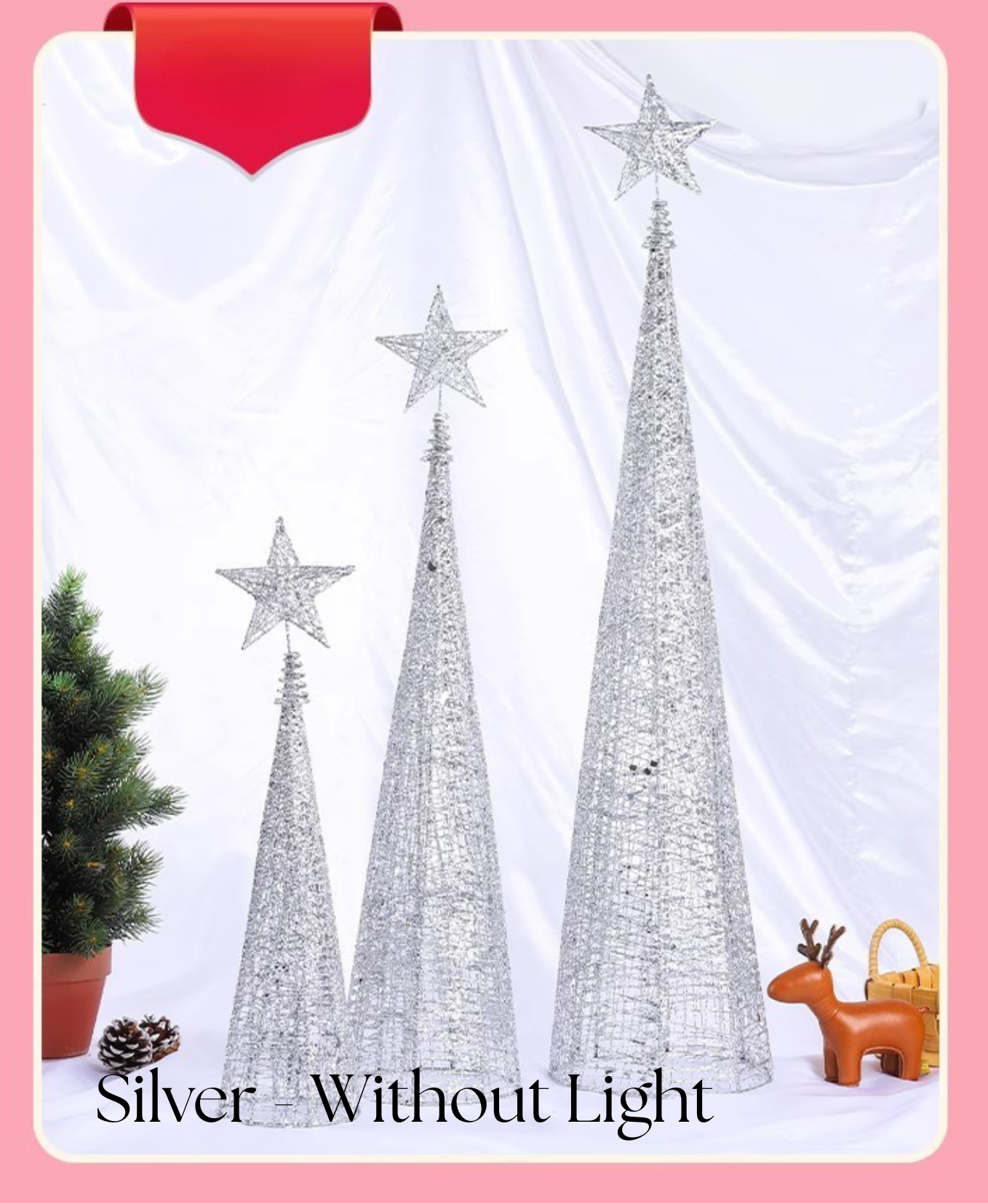 Add a magical glow to your holiday décor with the Illuminated Sparkle Iron Christmas Tree Set. This elegant set features three iron wireframe trees adorned with sparkling lights and a star on top.