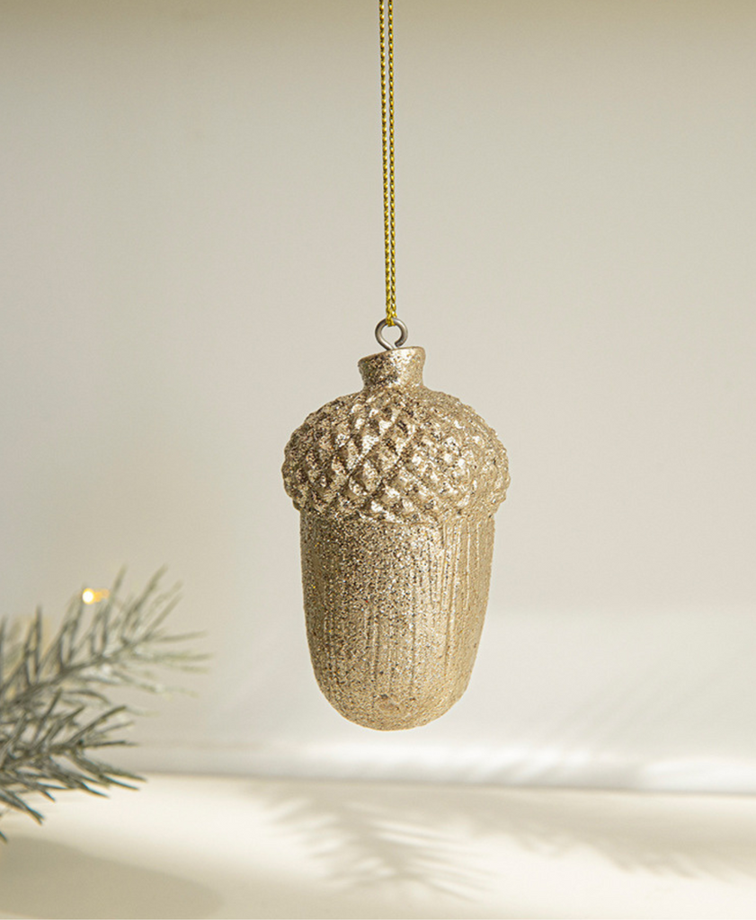 Add a touch of warm elegance to your holiday decor with this Silver Acorn Tree Ornament. Featuring a delicate golden finish and charming acorn design, it brings a cozy Nordic vibe to your Christmas tree.