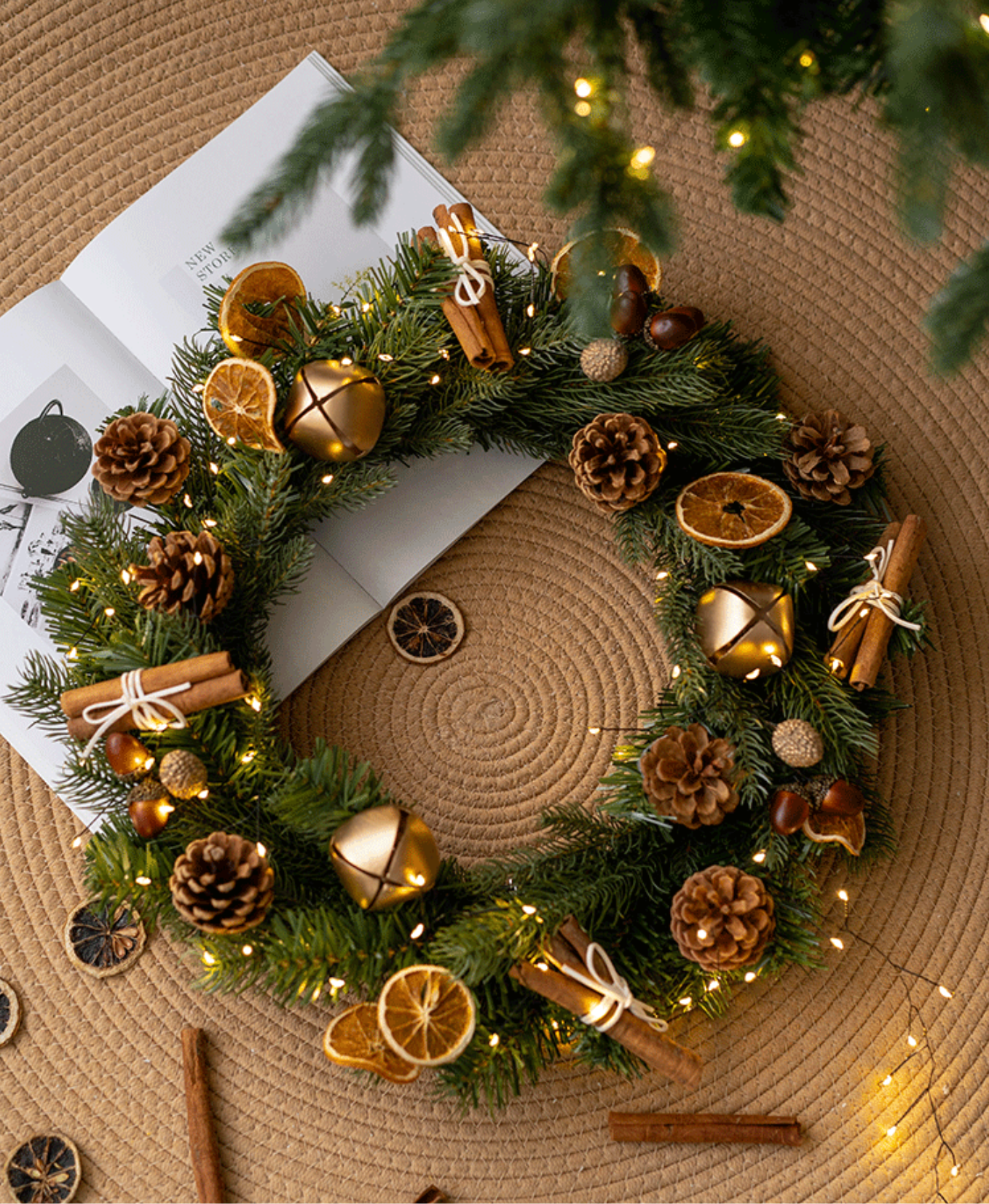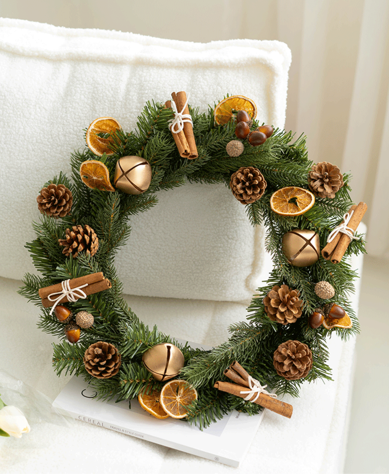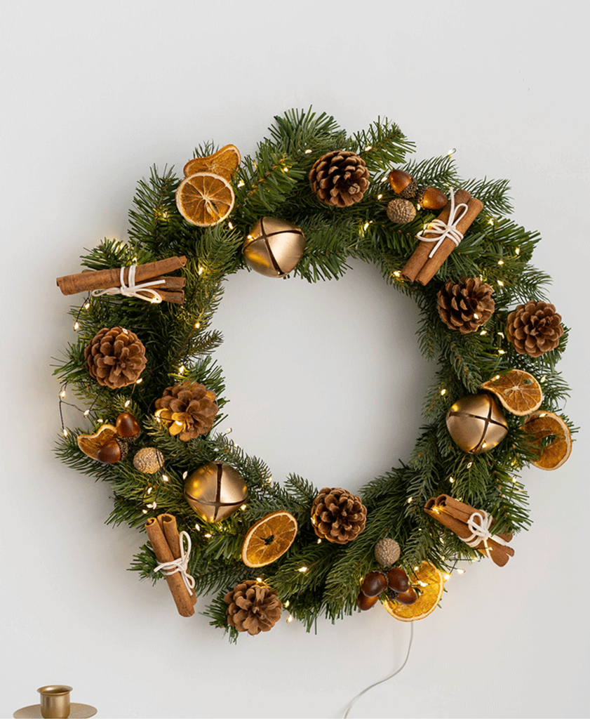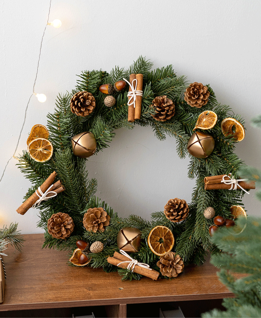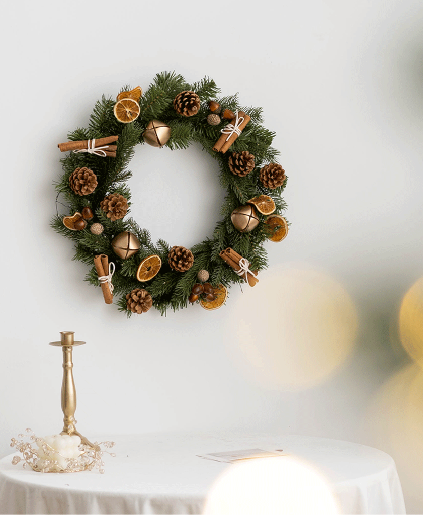 Elegant forest-inspired wreath adorned with pinecones, dried citrus, and cinnamon — bringing a warm, natural holiday touch to any space.