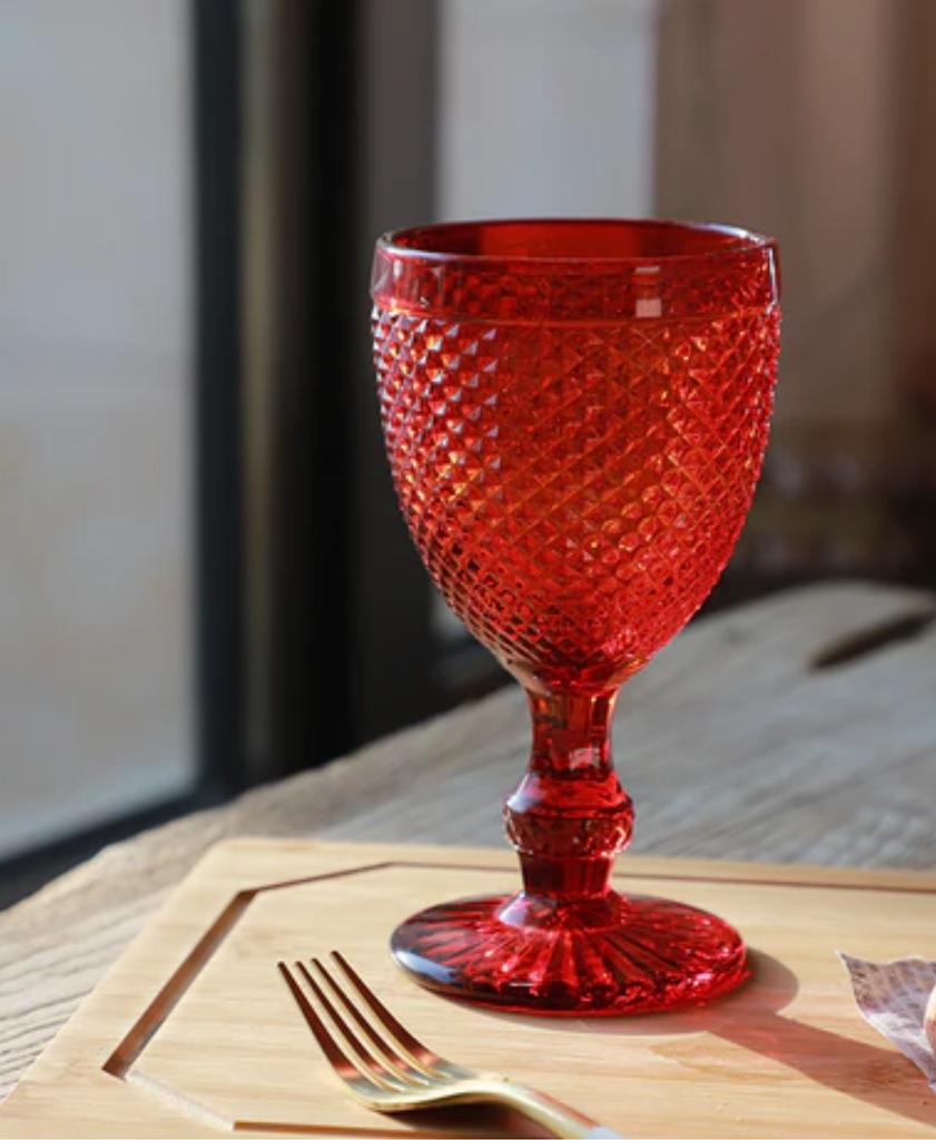 Elegant red glass goblet with a textured, diamond-patterned surface and a sturdy stem. Perfect for wine or decorative use.