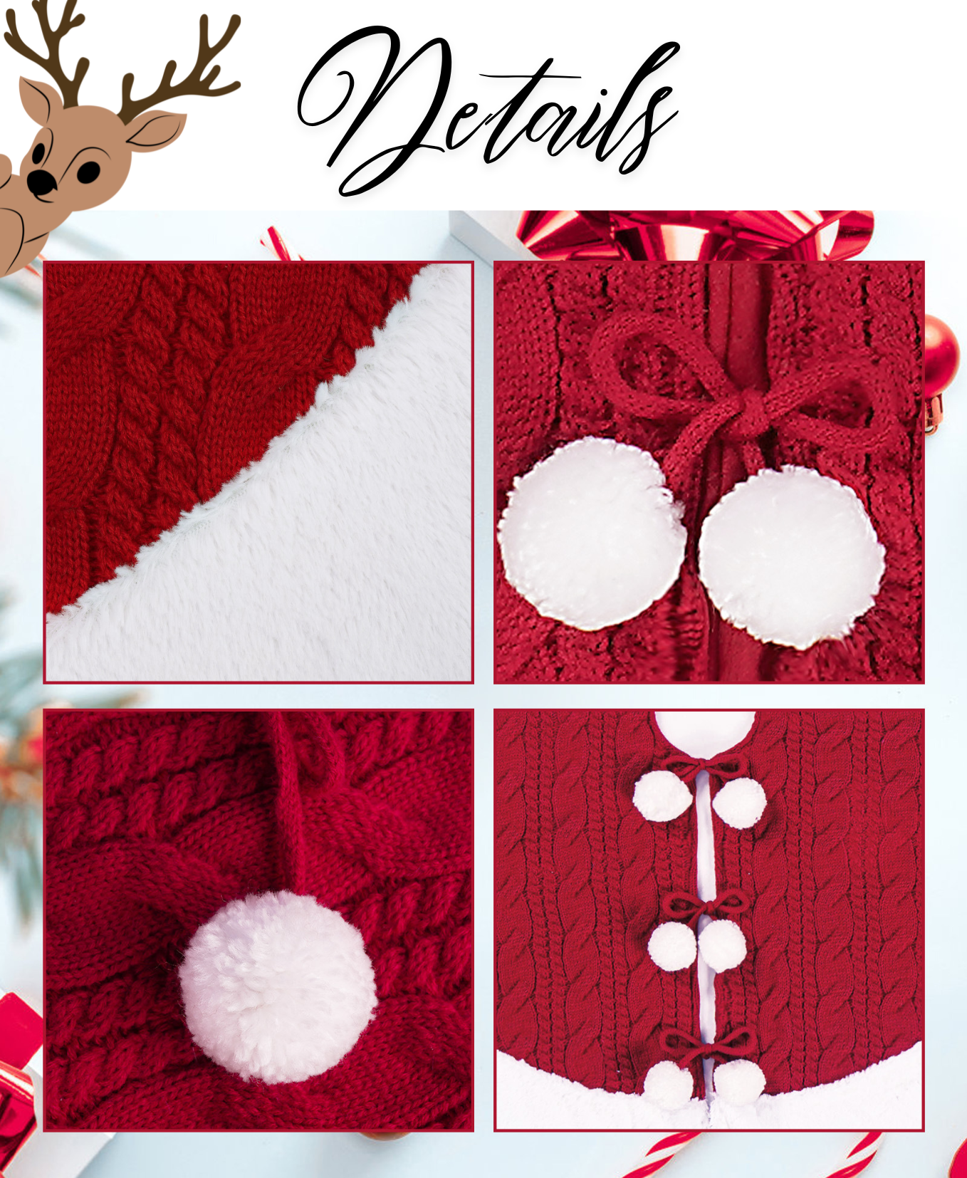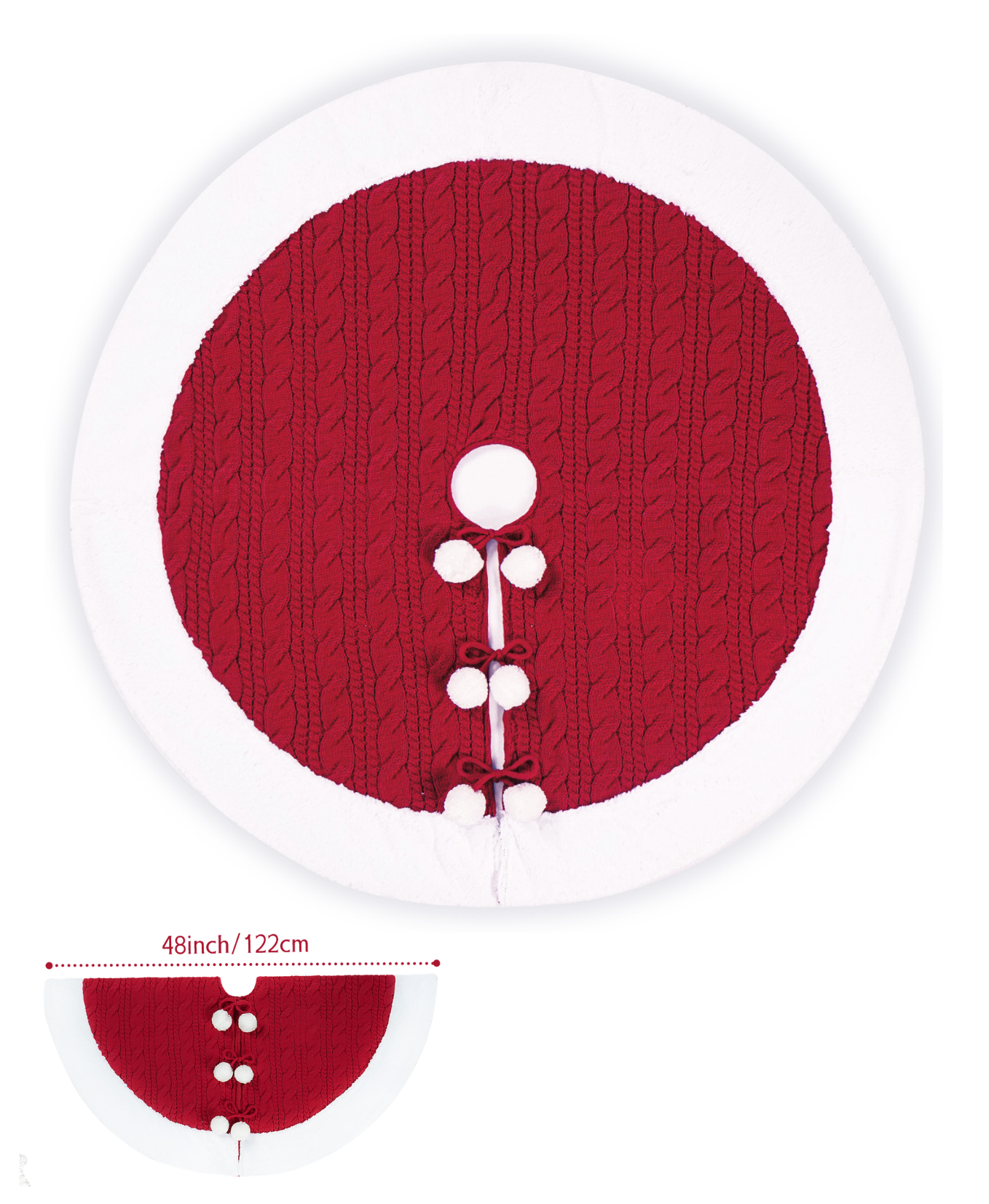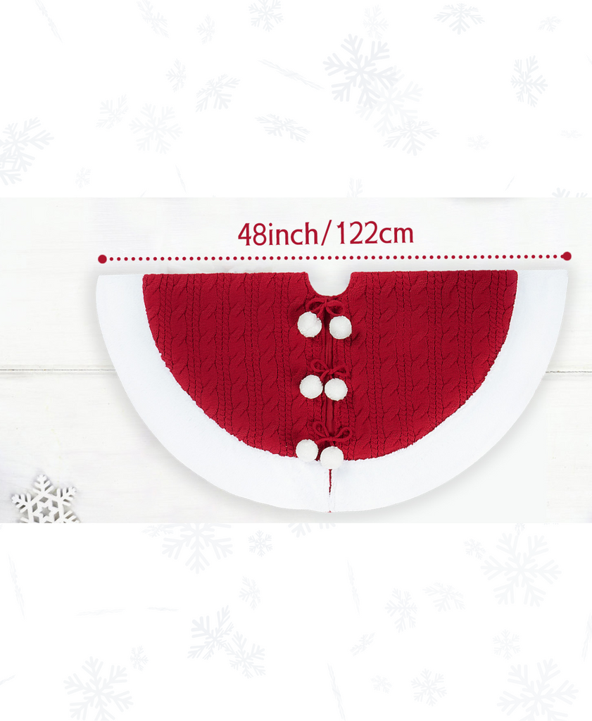 Add a cozy holiday charm to your tree with this cable knit tree skirt, featuring playful pom-pom accents and a soft plush border. Perfect for a warm, festive touch.