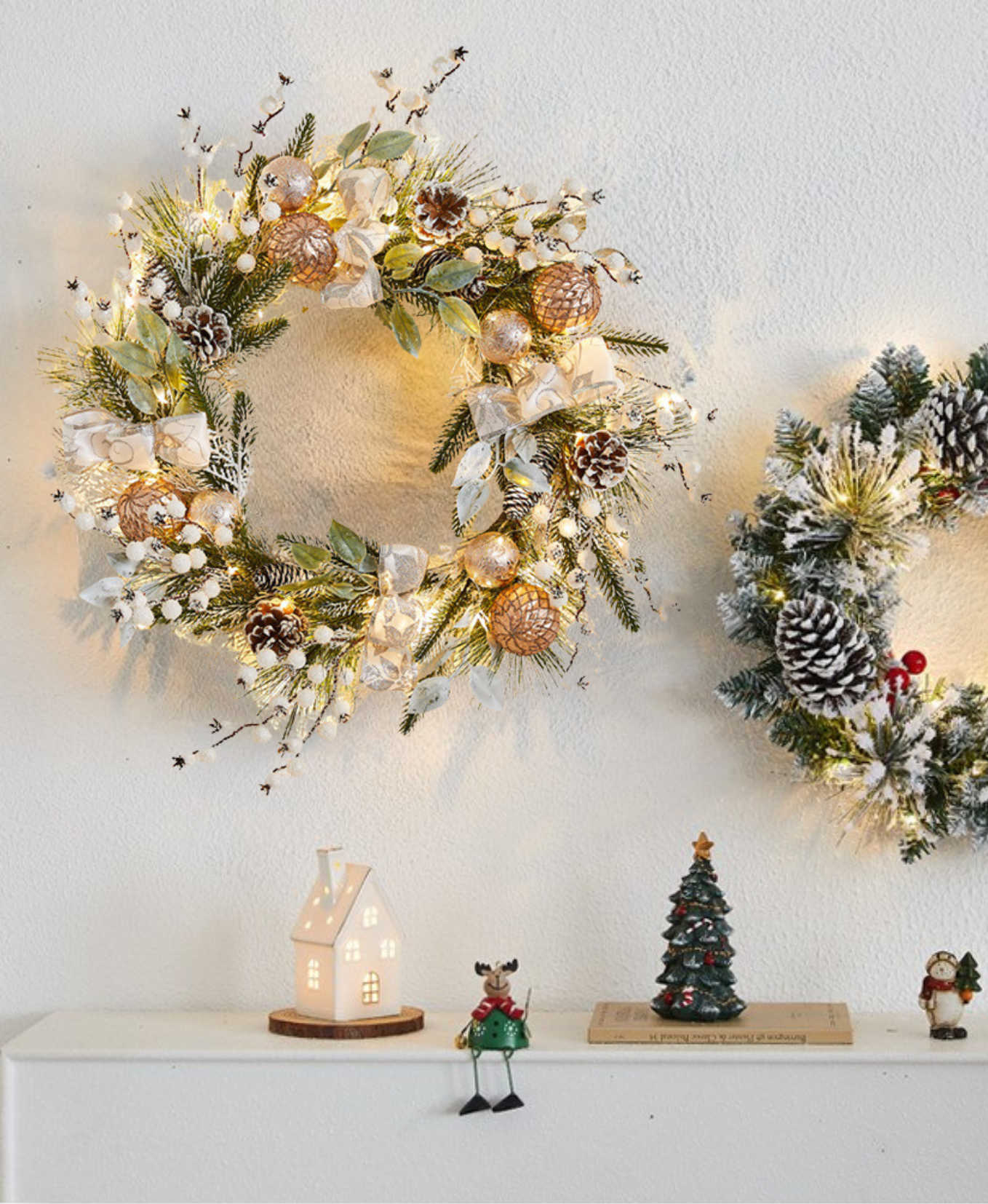 Champagne Frost Bloom Wreath brings together soft golden tones, frosted pinecones, ivory blooms, and twinkling lights — all handcrafted to capture the quiet beauty of a snow-dusted holiday.