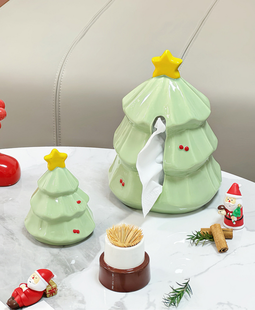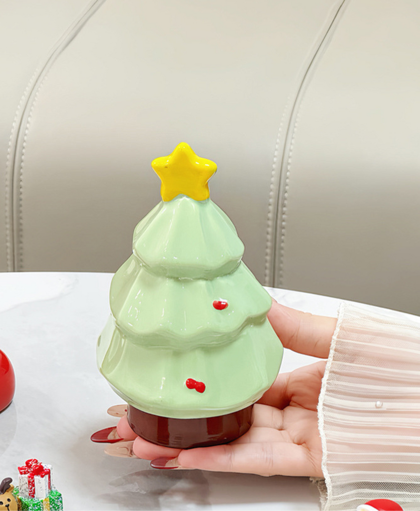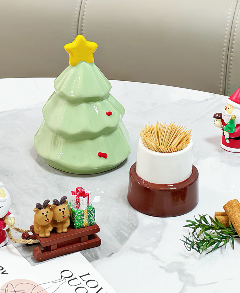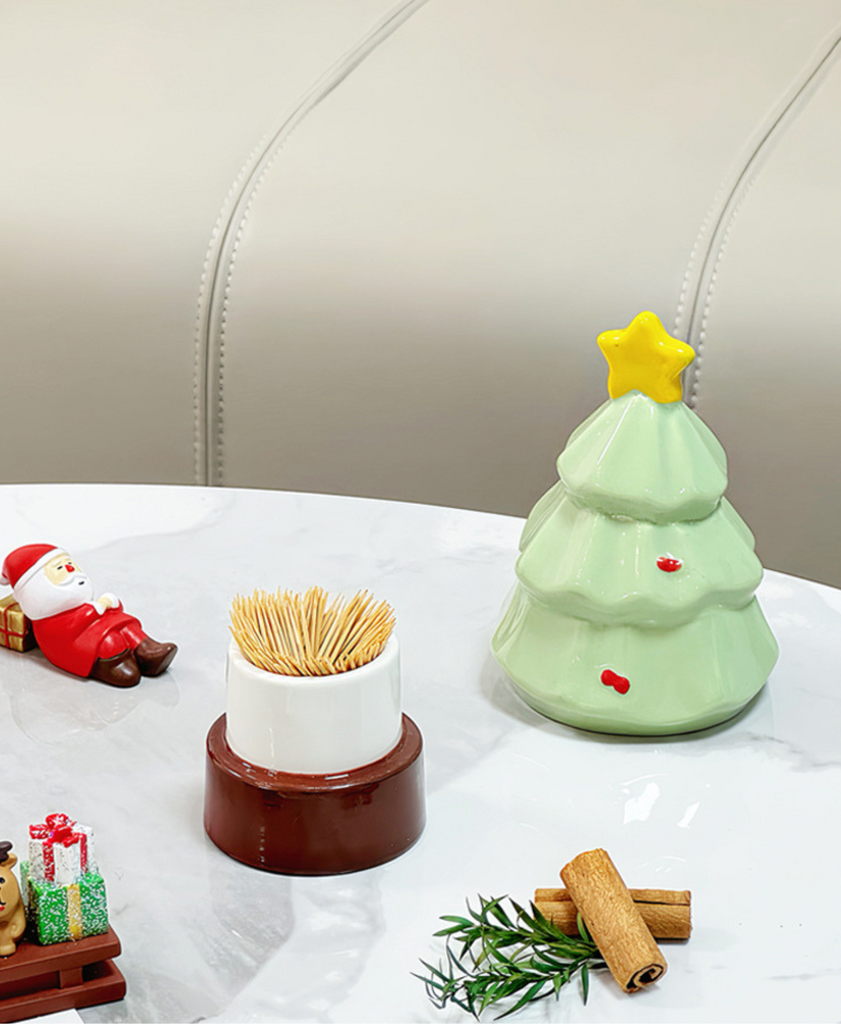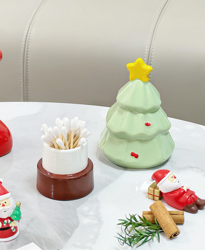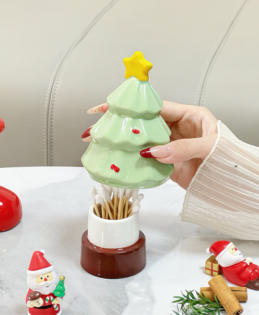 Festive ceramic holder for toothpicks, cotton swabs, or small items. Doubles as a cute Christmas decoration for any room.
