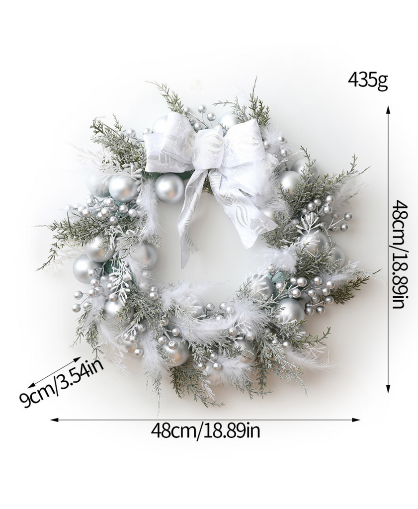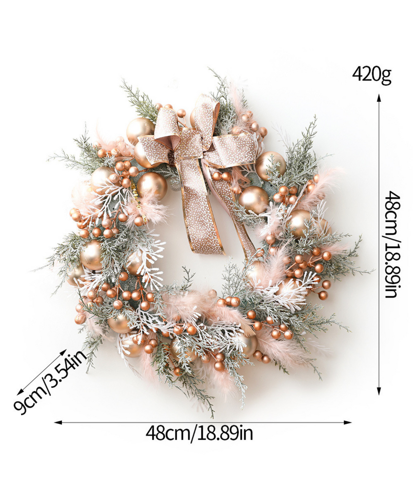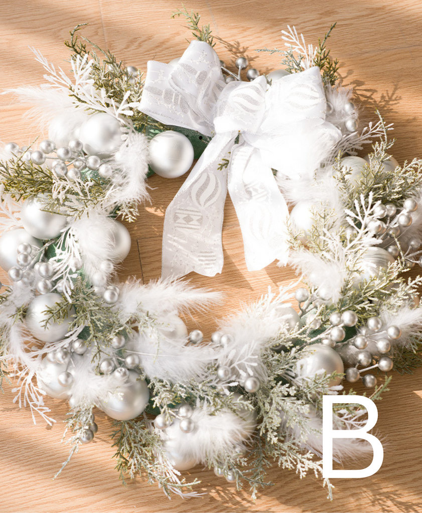 Soft and elegant, this wreath features delicate feathers, graceful PE flowers, and a charming bow accent. Perfect for your front door or wall, it adds a gentle festive touch with a modern, romantic twist.