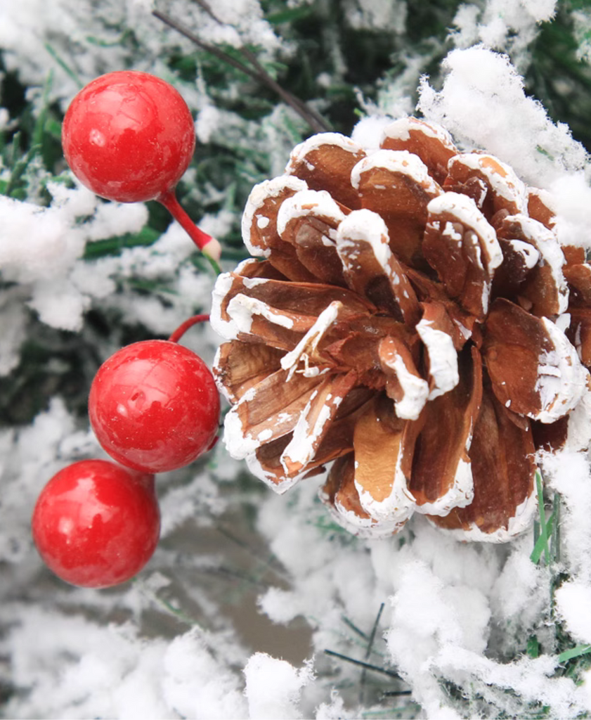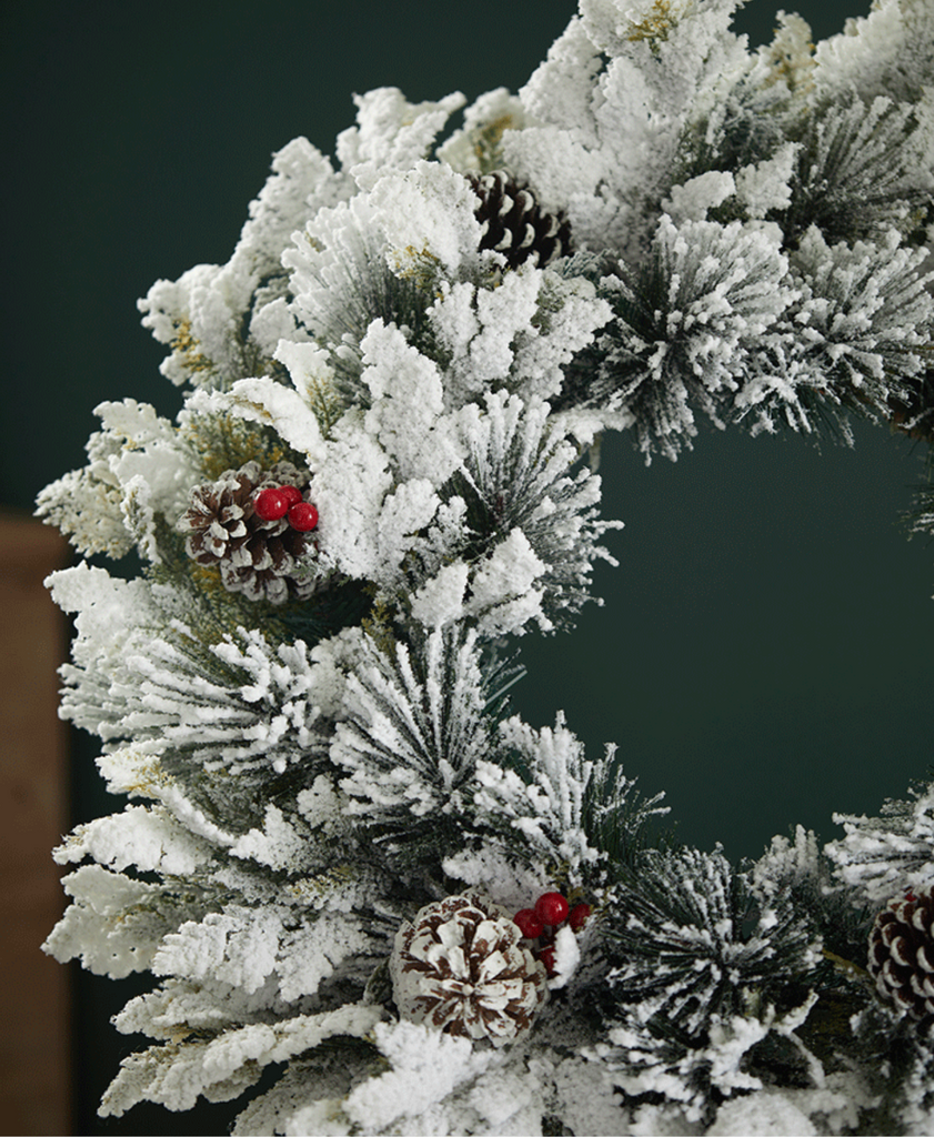Bring the magic of winter indoors with this elegant holiday wreath. Crafted from natural rattan and adorned with real pinecones and delicate snowflake accents, it's finished with a soft snowy flocking for a cozy, festive look. Perfect for hanging on doors, windows, or walls to add a warm seasonal charm to your space.