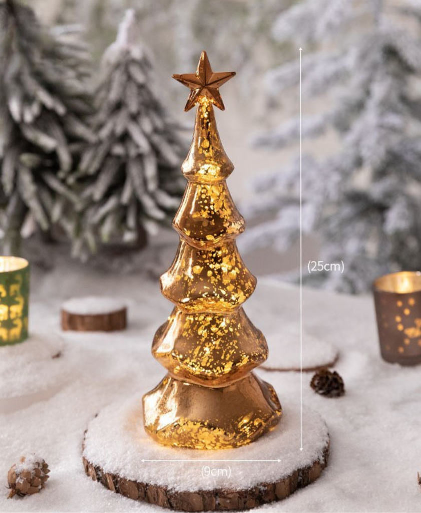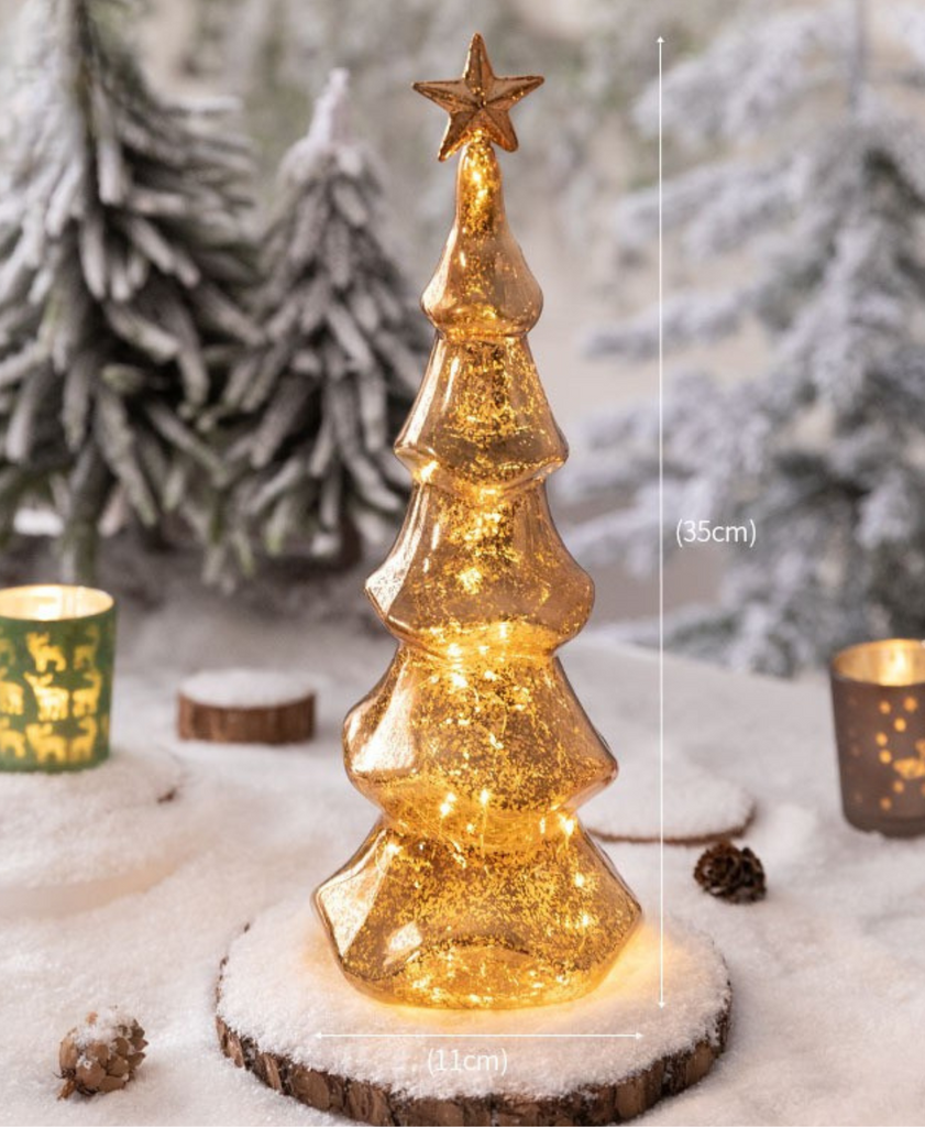 The Golden Sparkle Tree Light features a sculpted metallic gold tree with shimmering light effects from within — creating a warm, magical ambiance perfect for holiday tables, mantels, or cozy corners.
