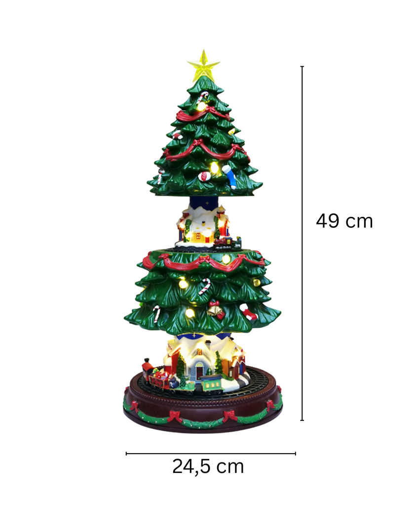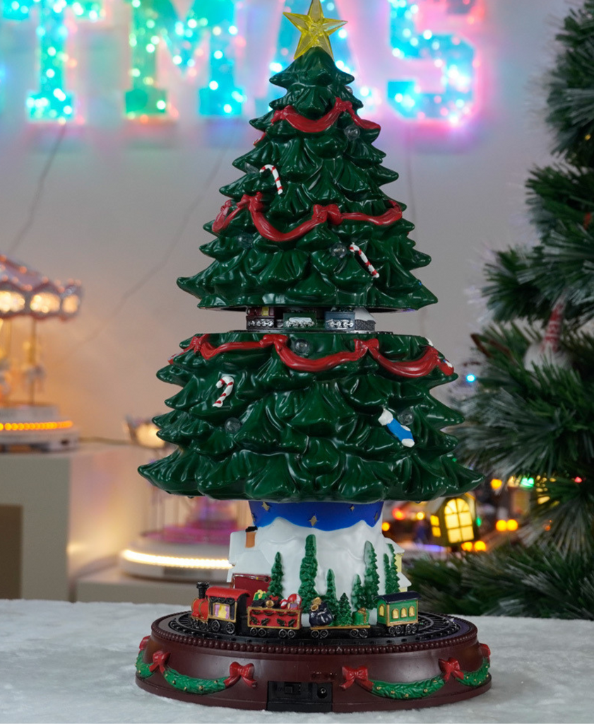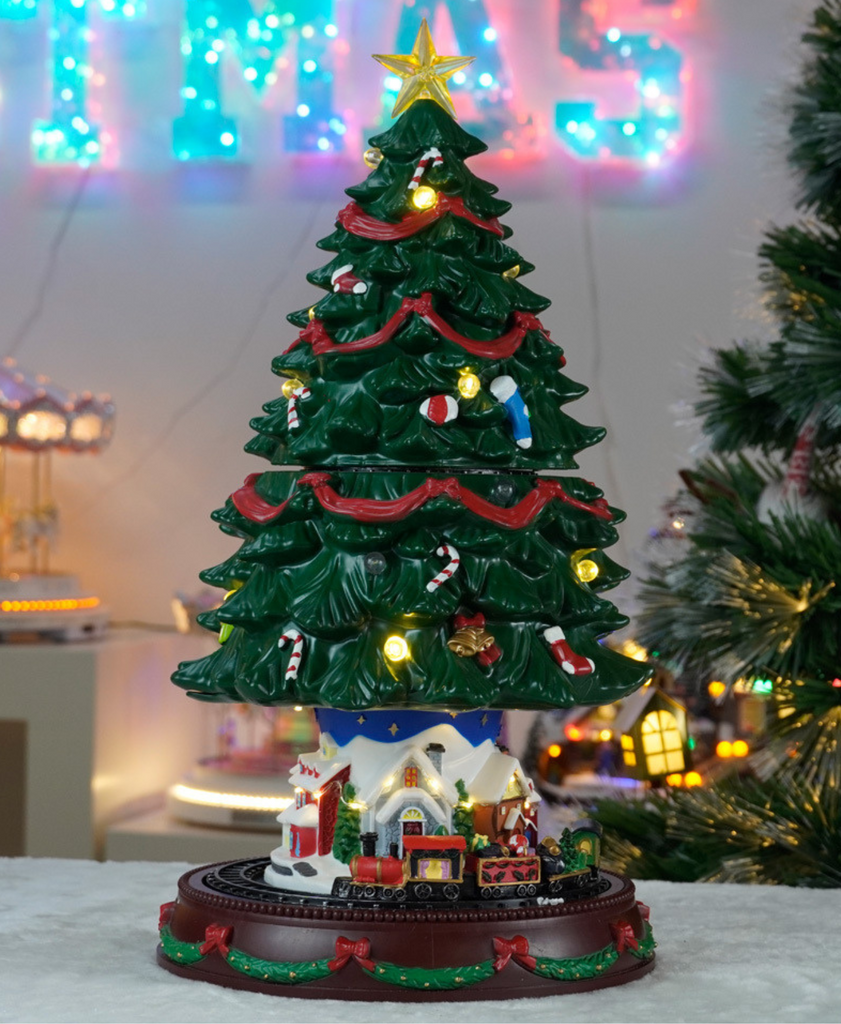 This luminous Christmas tree music box features a rotating train inside, creating a magical holiday centerpiece with music and movement.