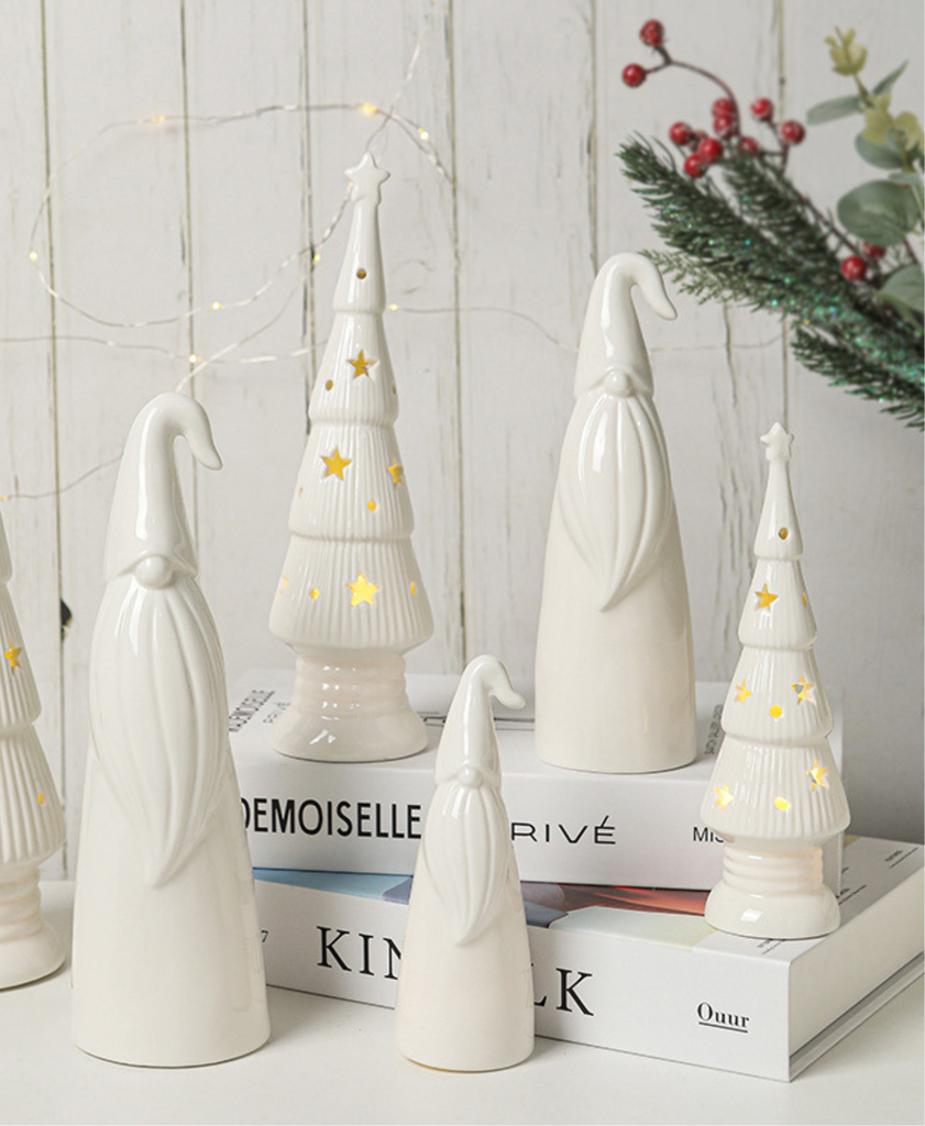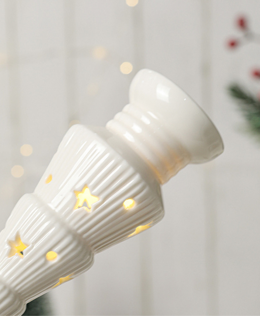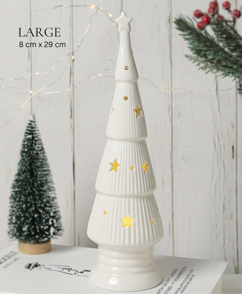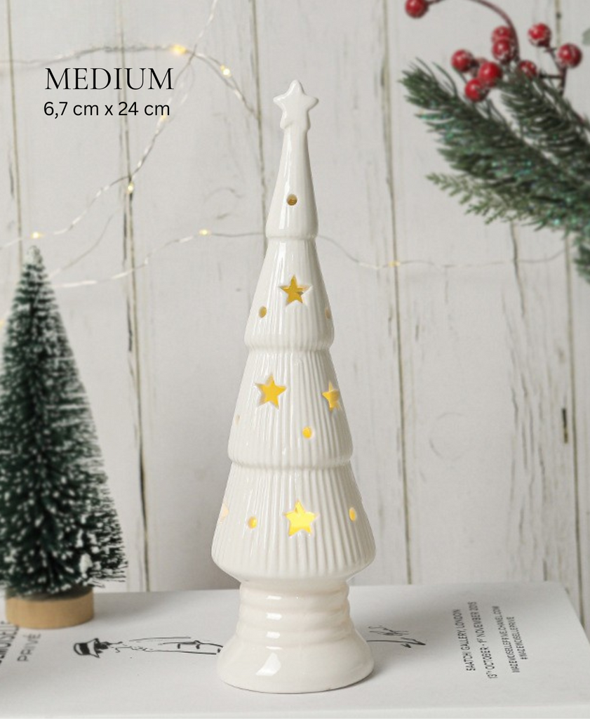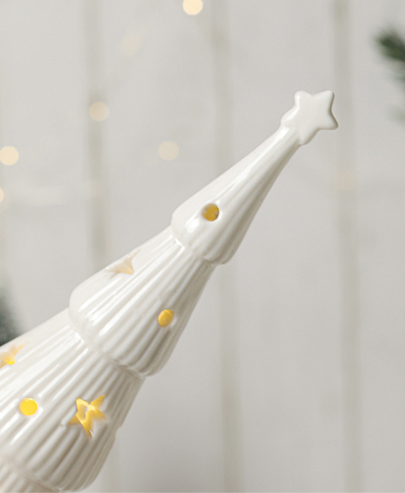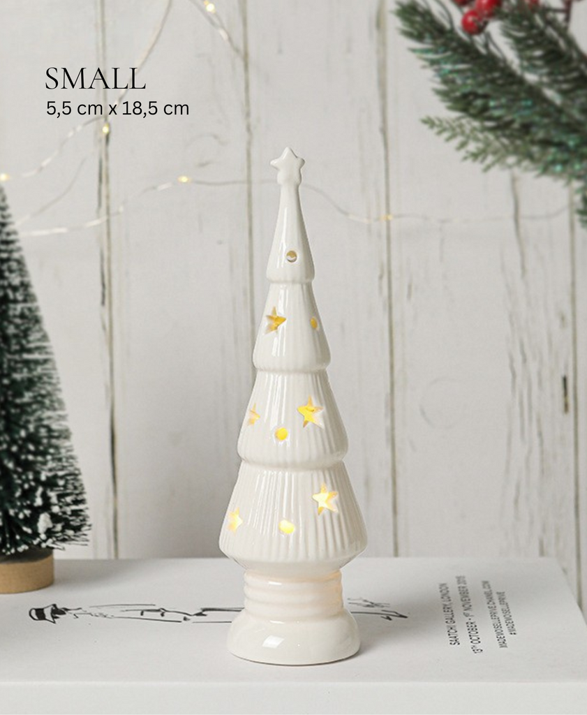 A sculptural porcelain tree delicately illuminated from within. Featuring intricate star-cut perforations, this luminous piece adds an understated elegance to any festive setting. Timeless. Serene. Refined.