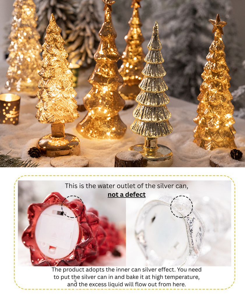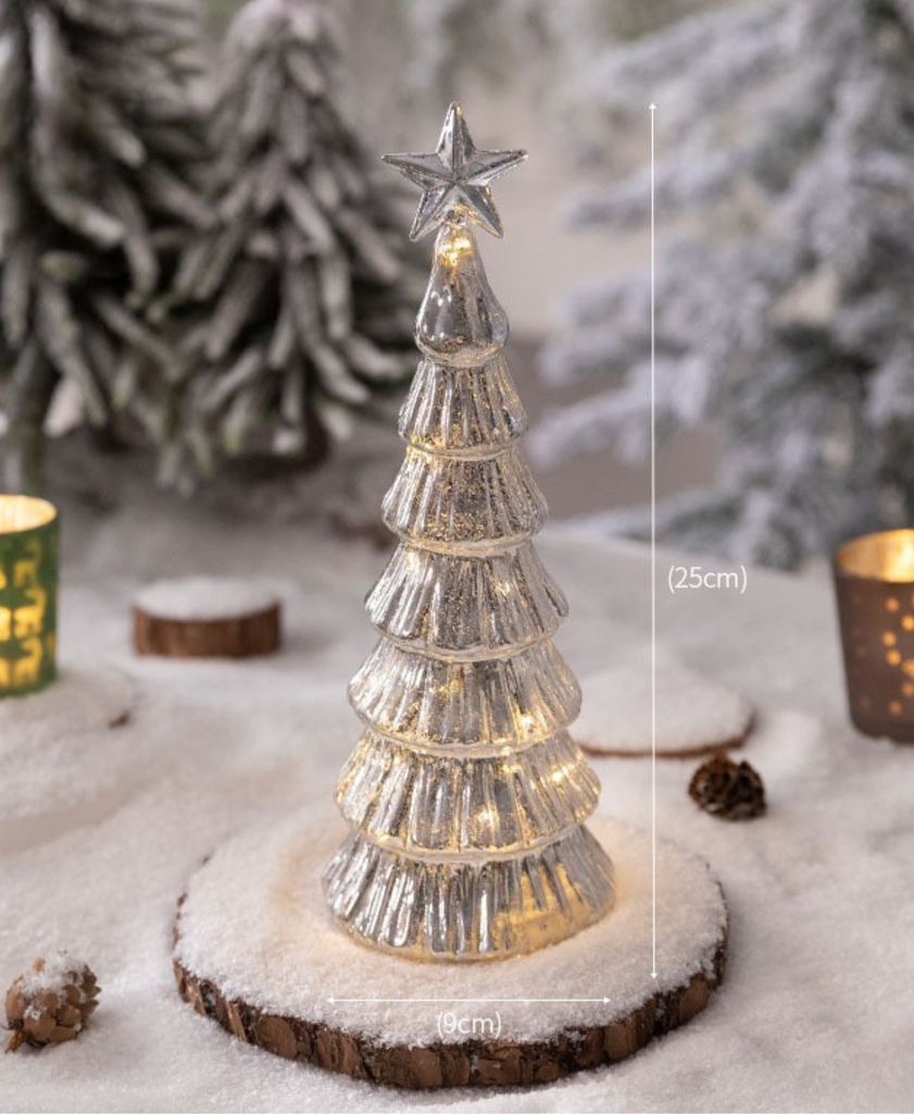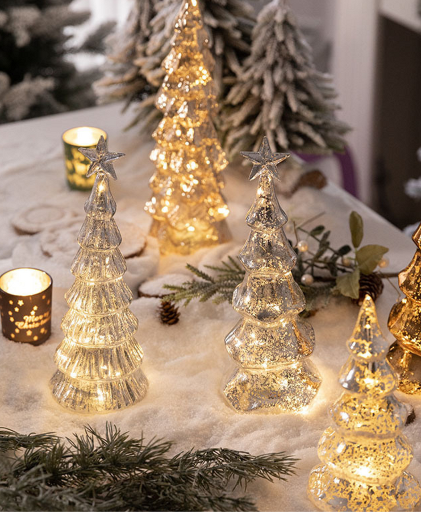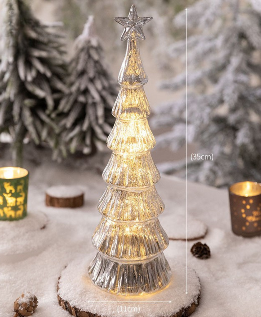 The Luminous Silver Tree Light features a tall glass silhouette with warm glowing lights inside — perfect for adding a refined sparkle to your holiday space.