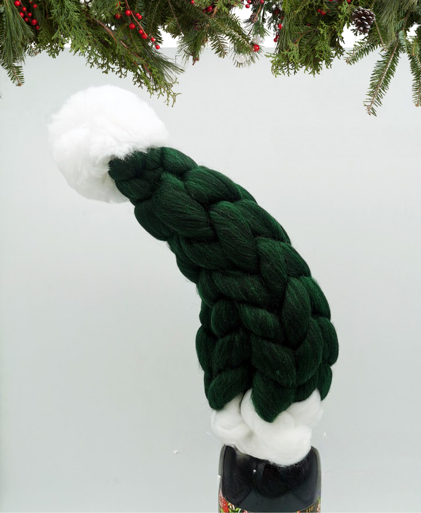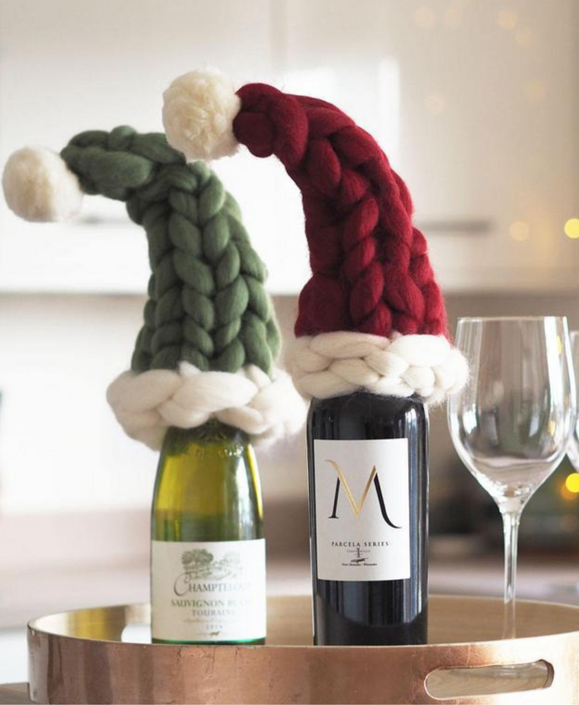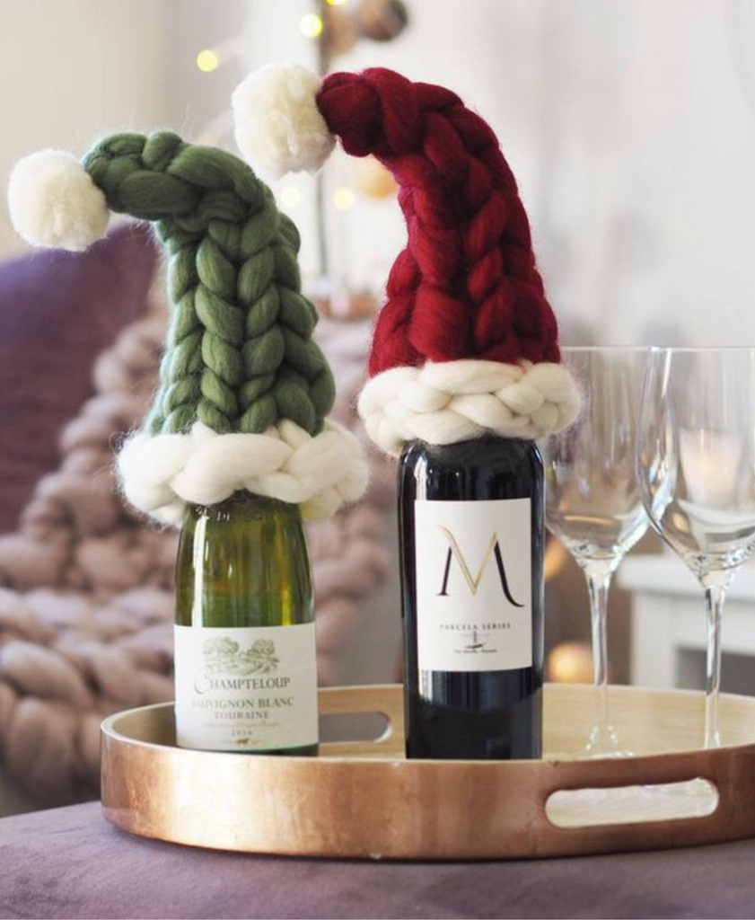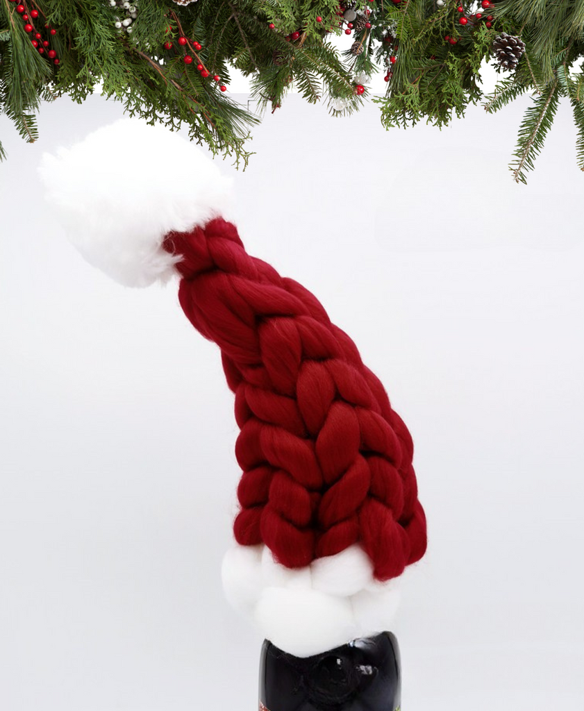 A chunky hand-knit piece that adds cozy charm to your festive bottle or tree top. Timeless, warm, and full of holiday spirit.
