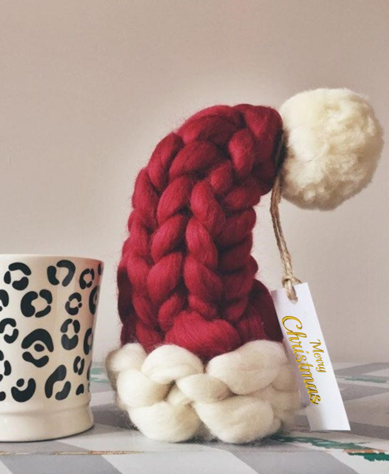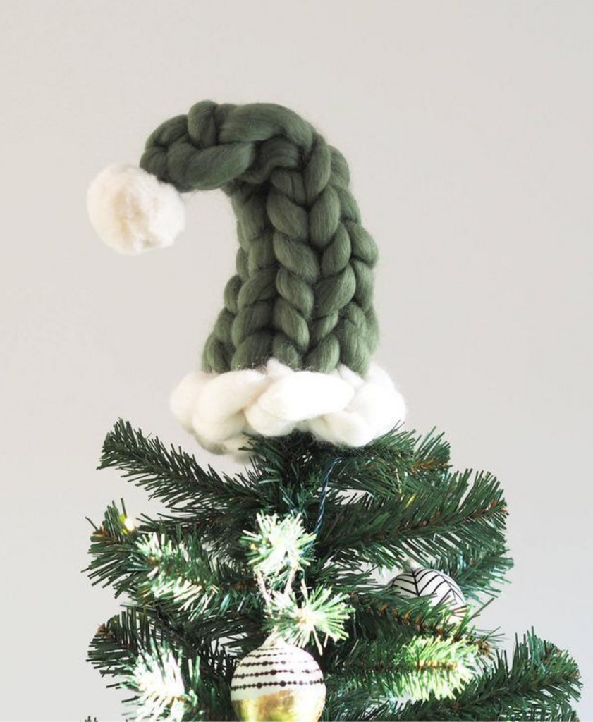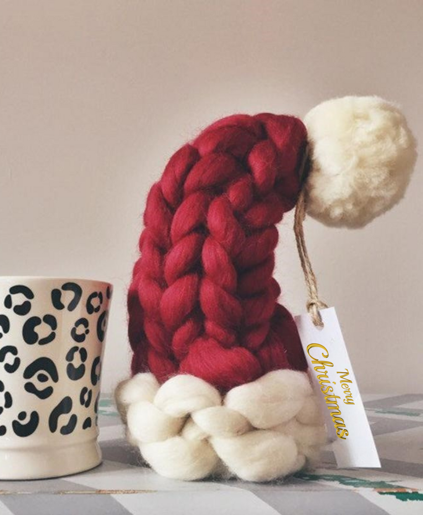 A chunky hand-knit piece that adds cozy charm to your festive bottle or tree top. Timeless, warm, and full of holiday spirit.