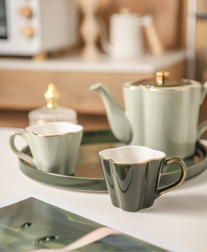 A stylish tea set with a blend of deep and pastel green tones, finished with gold accents.perfect for tea time or special gatherings.