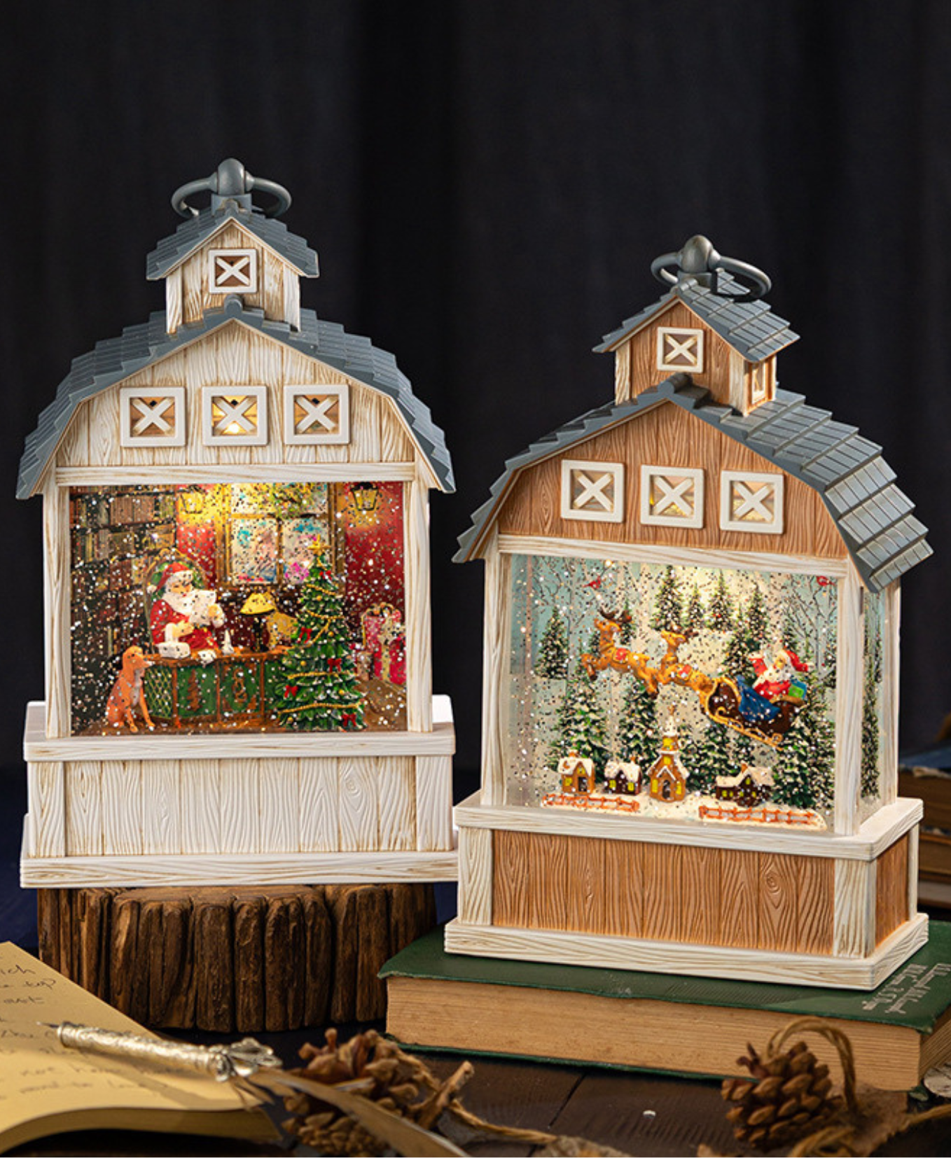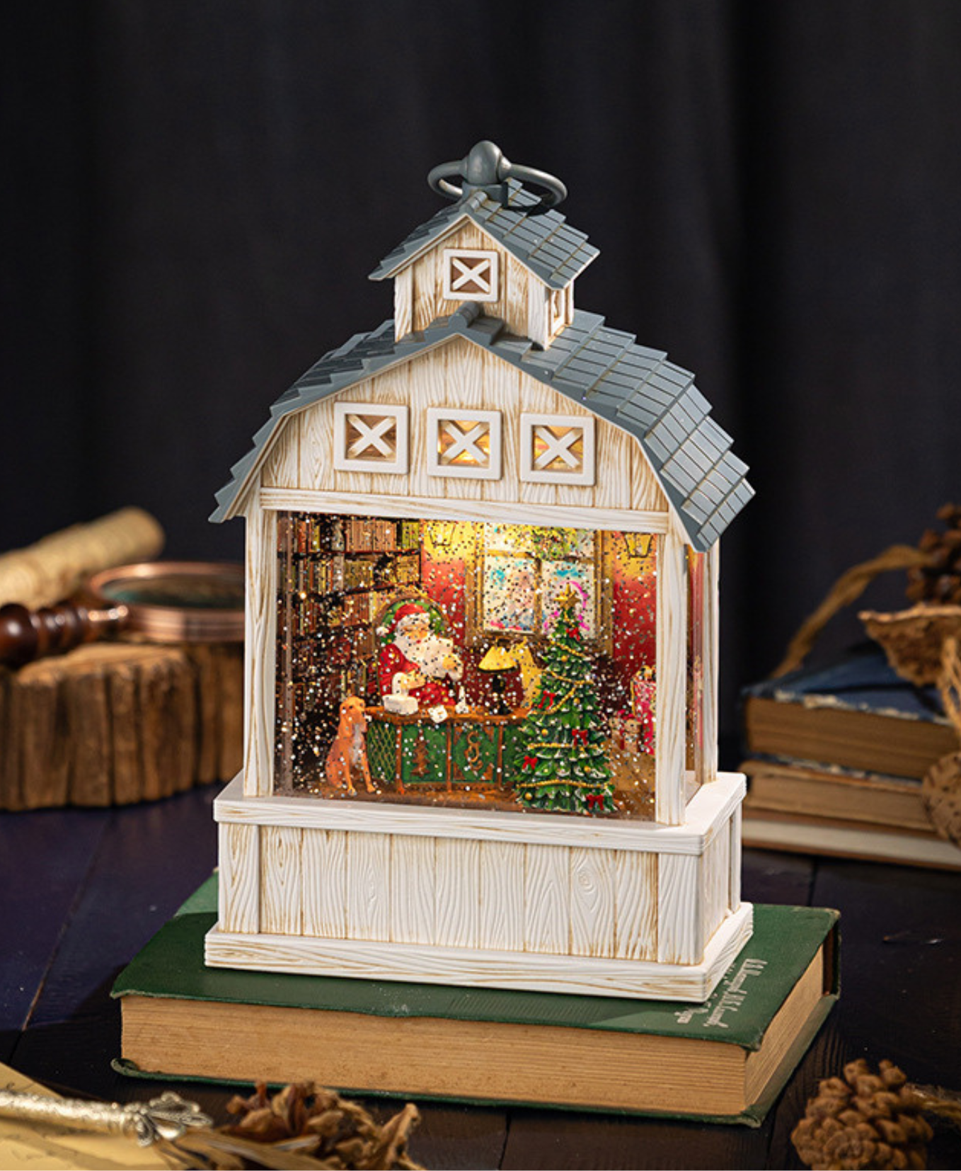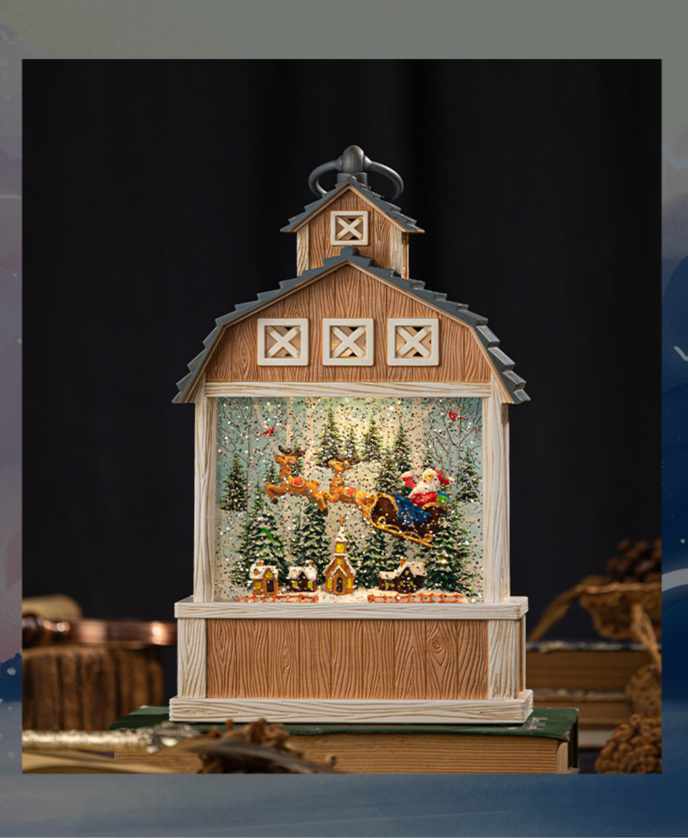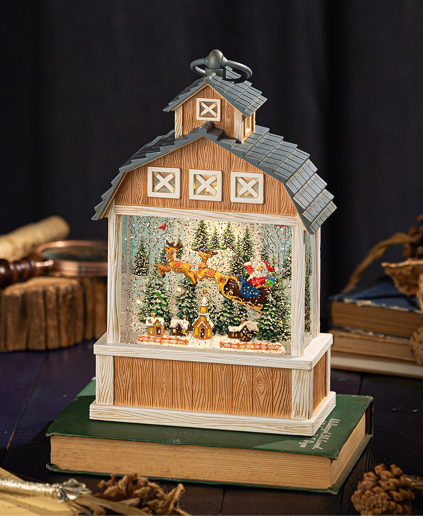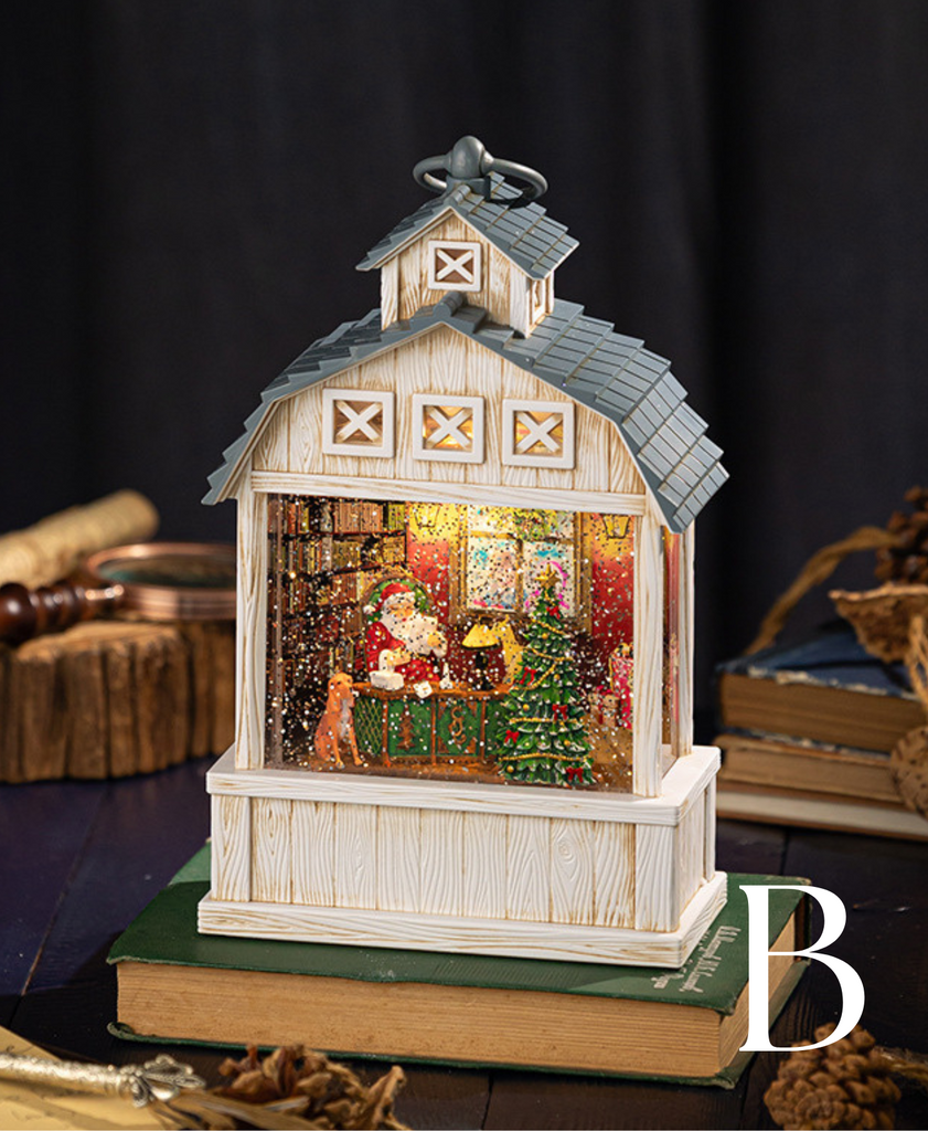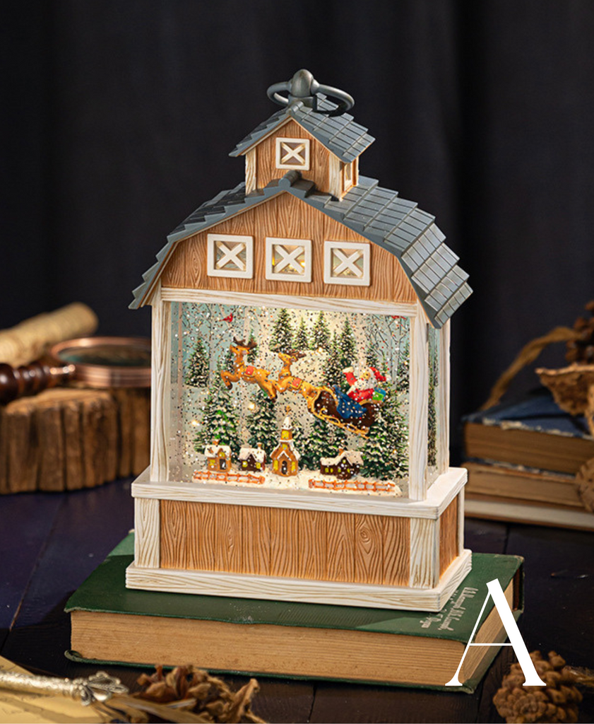 A rustic-style Christmas music decoration featuring Santa inside. Equipped with warm lights and soothing music, creating a magical and joyful holiday atmosphere. Perfect as a festive ornament and special gift.