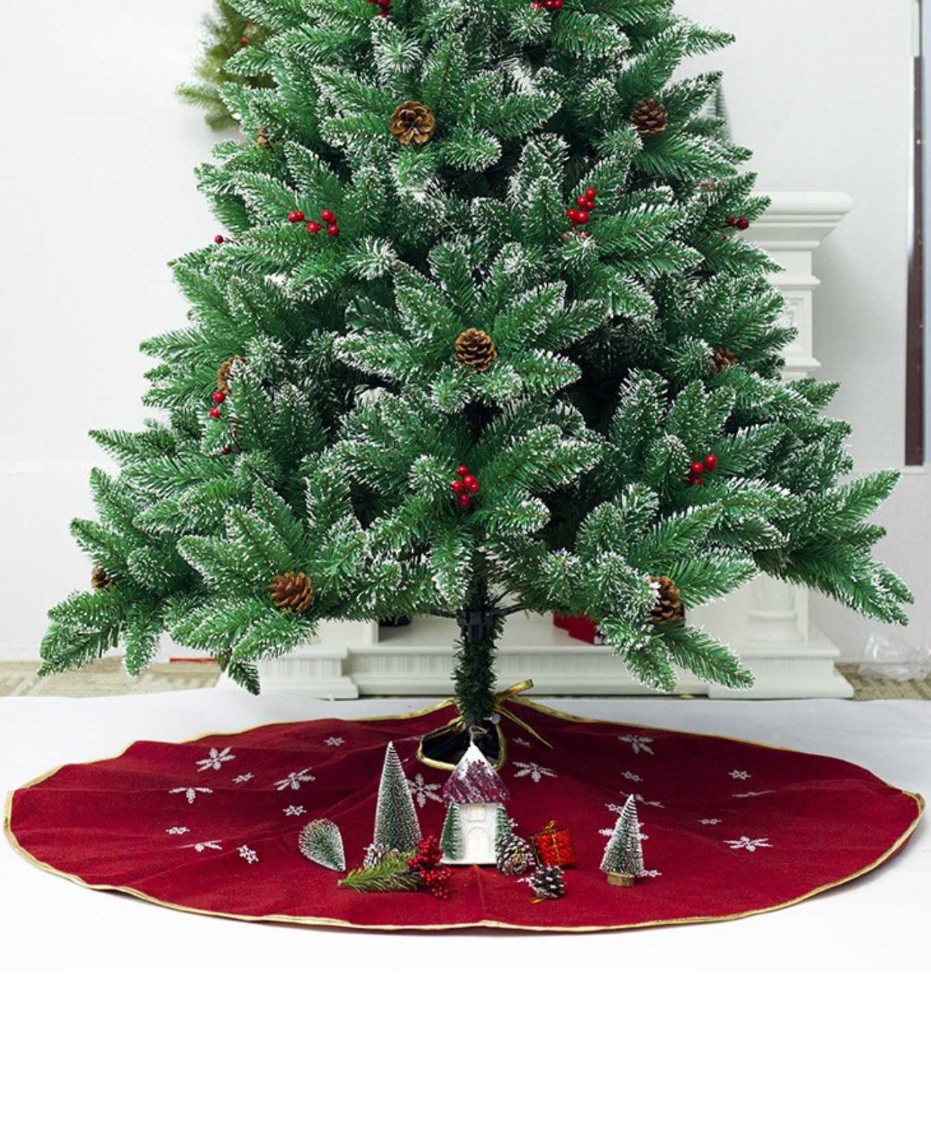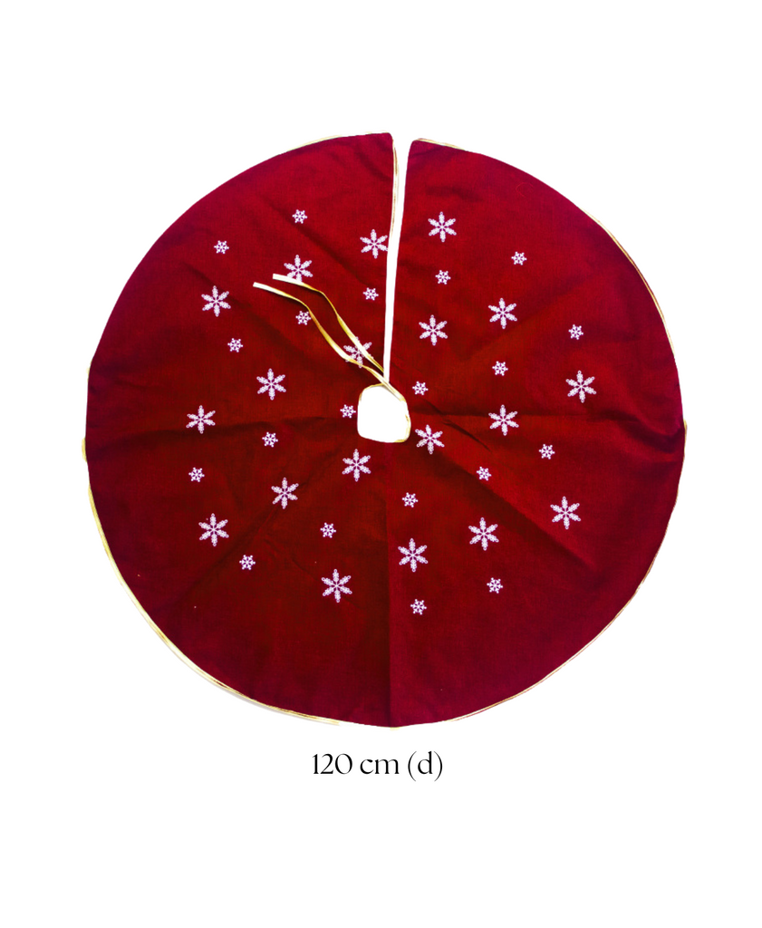 Add warmth and charm to your holiday decor with this rustic-inspired red tree skirt, featuring delicate snowflake patterns and natural textures. Perfect for creating a cozy festive atmosphere.