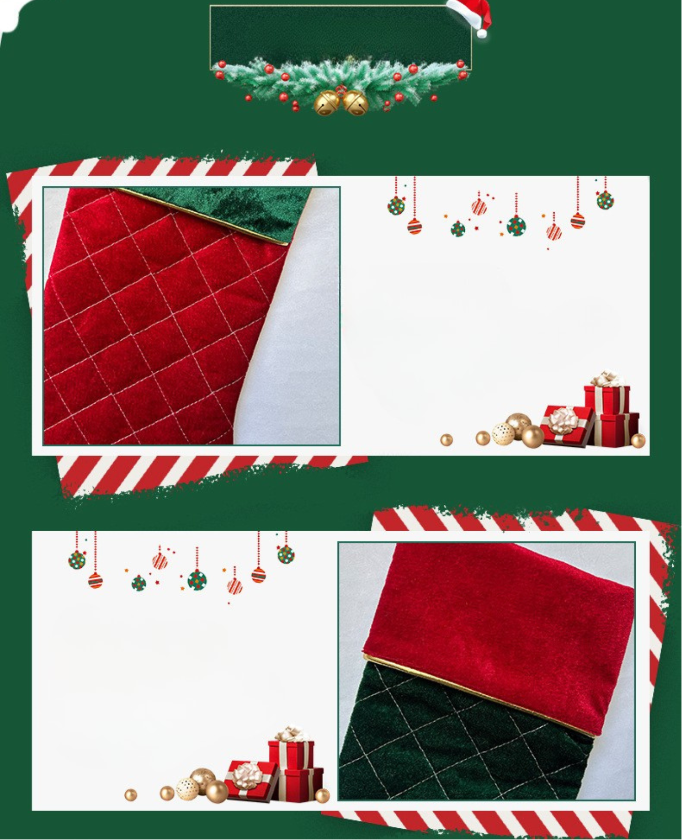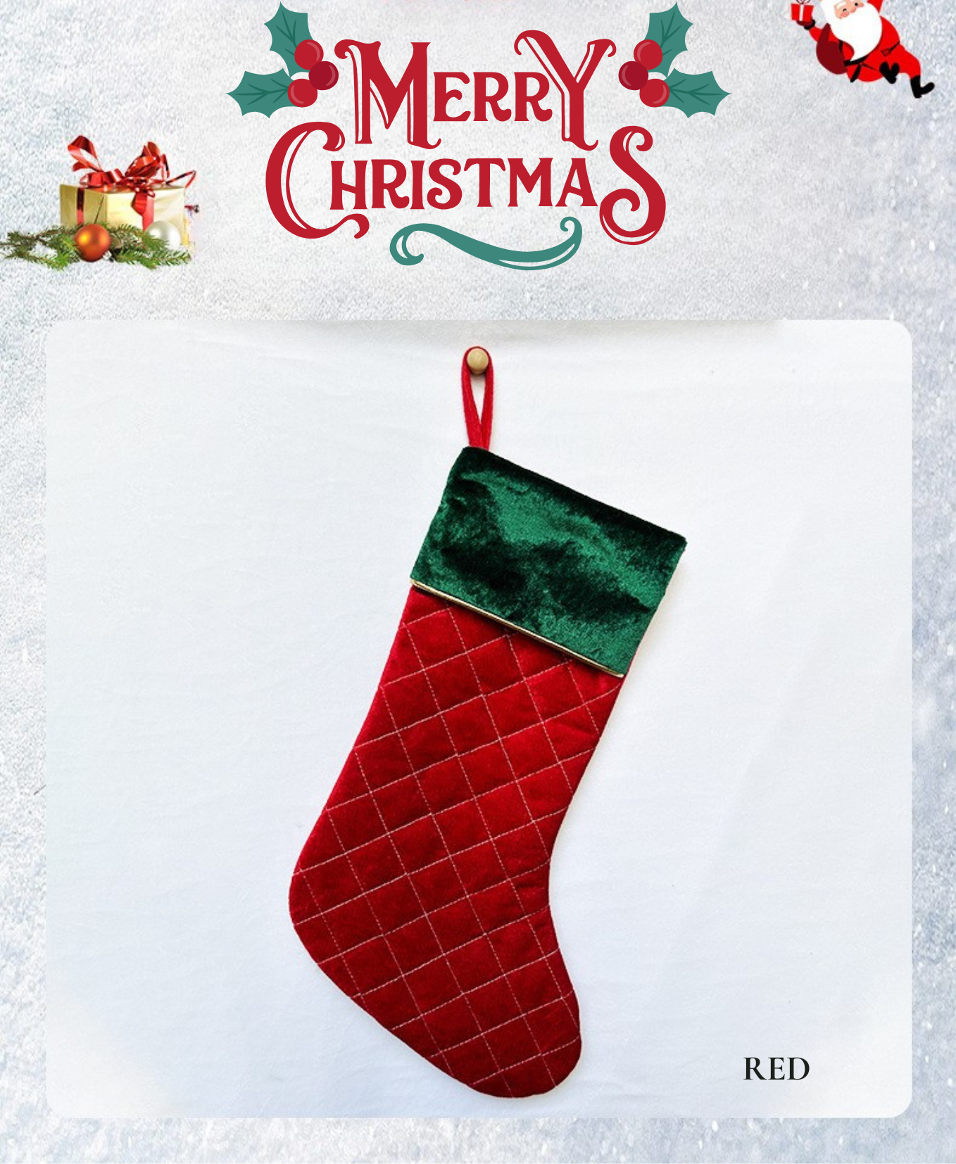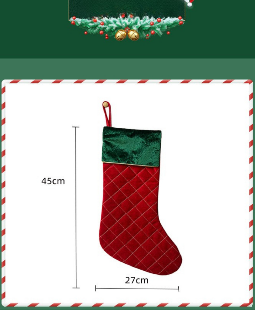 Featuring rich velvet in red & green with a quilted gold grid—perfect to hang by the fireplace or stuff with treats.